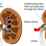 Eliberarea de unde de soc dintr-un dispozitiv lipit de pielea pacientului, unde care sunt focalizate pentru a sparge pietrele din rinichi in fragmente sufficient de mici pentru a putea fi eliminate pe cale naturala; aceasta implica utilizarea de raze X sau ultrasunete pentru a localiza/tinti piatra.